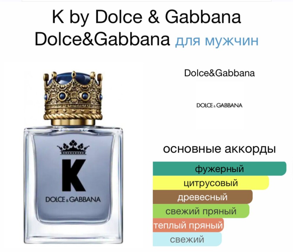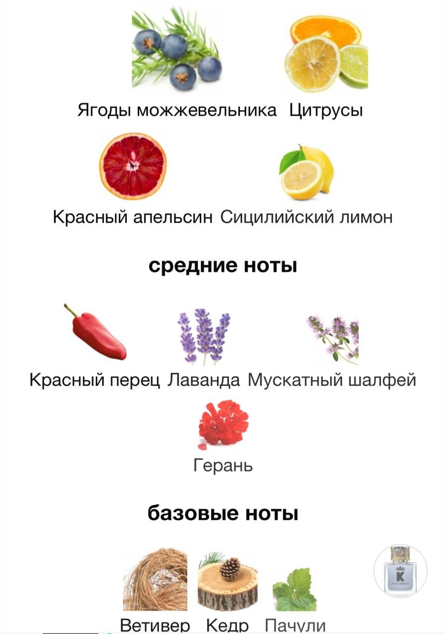 Пряно-древесный средиземноморский аромат. Аромат K by Dolce&Gabbana воплощает дух харизматичного и благородного мужчины, уважающего традиции, но открытого для всего нового. Свежие средиземноморские цитрусовые ноты красного апельсина и сицилийского лимона пробуждают чувства. В сердце аромата ноты цитруса подчеркнуты с помощью амбровых акцентов мускатного шалфея в сочетании с яркими нотами герани и бодрящего лавандина. Неожиданная нота эссенции красного перца придает аромату K by Dolce&Gabbana яркую индивидуальность. Затем раскрываются чувственные ноты кедра, которые дополняют два элегантных и мужественных ингредиента: зеленый ветивер и пачули. K by Dolce&Gabbana — это огненный аромат для харизматичных и крайне соблазнительных мужчин.