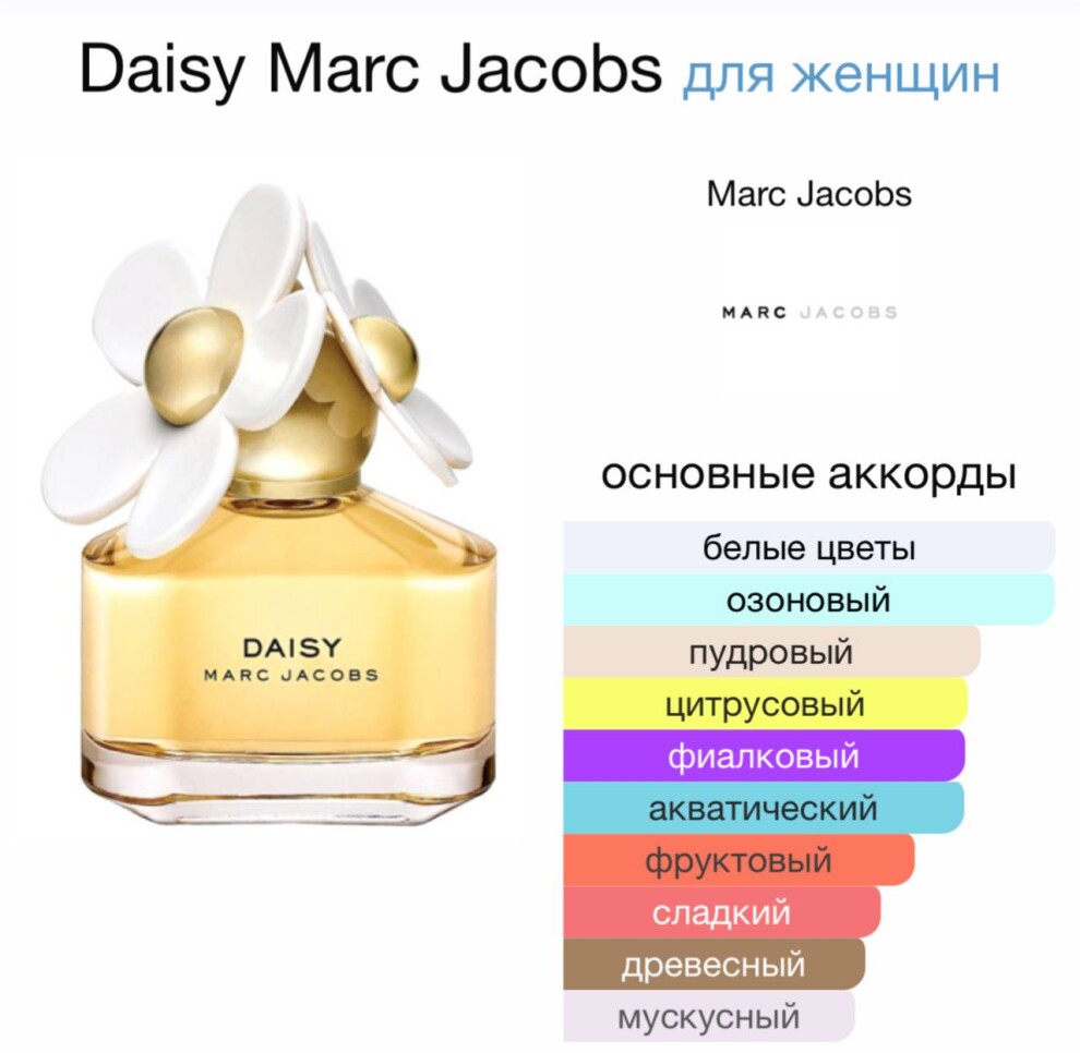 Туалетная вода для женщин Marc Jacobs Daisy олицетворяет радость беззаботной юности. Это окно в прекрасный мир, где нет волнений и тревог. Аромат для женщин, которые стремятся жить полной жизнью. Сияющие женские духи Marc Jacobs – это чистый экстракт жизнерадостности, эликсир солнечного света. Они безупречно отражают философию женщины Daisy: блистать, всегда быть на волне оптимизма, жить играючи и не тратя времени на банальности. Восхитительный цветочный аромат напоминает о золотистых лучах солнца над полями маргариток и корзинке сочных, только что сорванных лесных ягод. Ноты белой фиалки словно окутывают пейзаж туманной дымкой, как на размытом полароидном снимке, запечатлевшем случайный момент. Бархатистый жасмин в сердце дарит аромату легкие крылья, трепещущие на фоне чувственного и глубокого сандалового дерева в шлейфе, которое придает композиции женской туалетной воды романтичный флер и долгое звучание.
