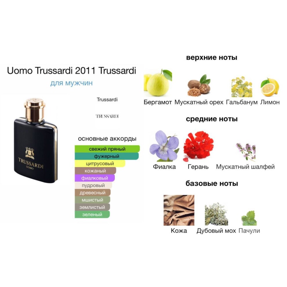 TRUSSARDI Uomo – это аромат дерзкого и уверенного в себе мужчины, настоящего победителя, авторитетной личности. Парфюм сочетает в себе классический для Италии тандем лимона и бергамота, также здесь четко улавливаются нотки шалфея, гальбана, мускатного ореха, герани, фиалки, пачули. Аромат имеет выраженный аккорд натуральной кожи, который заключает в себе мужественность и элегантность. Аккорды мха придают аромату дополнительный эксклюзив и нестандартность.